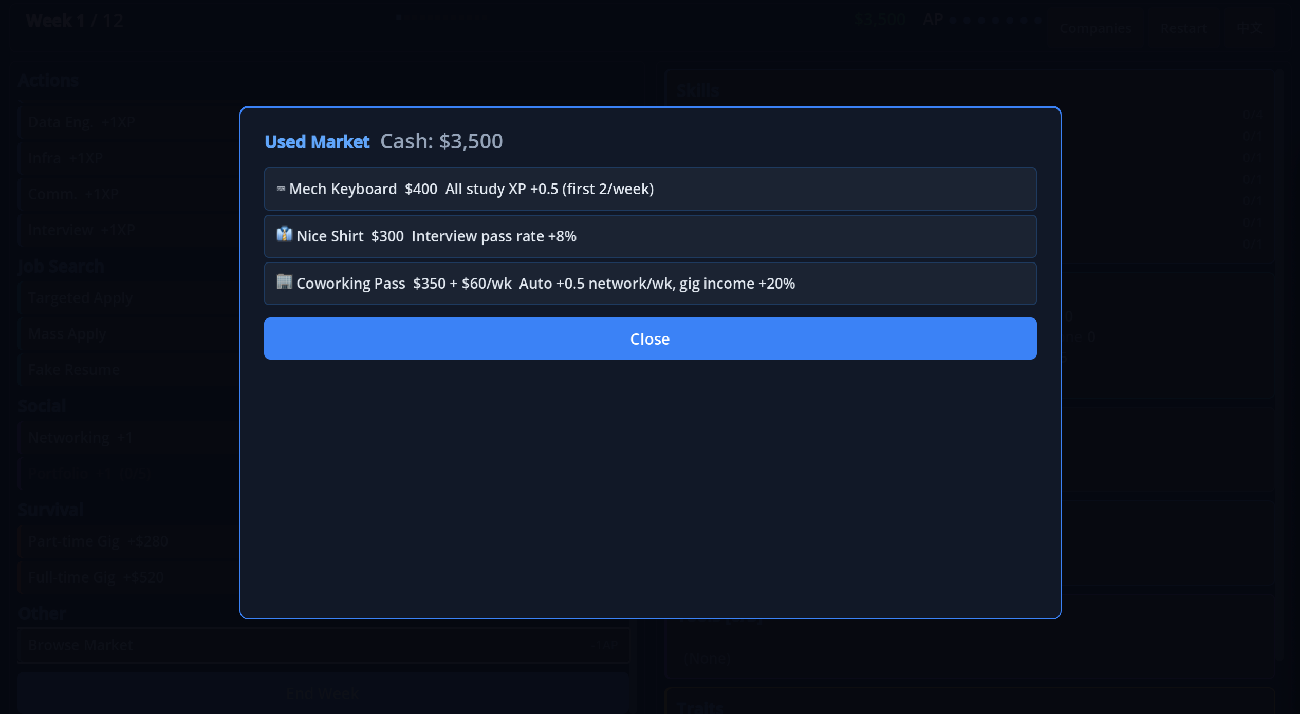 - Tools & Traits — Buy a LeetCode membership, brew your own coffee to save rent money, or land a trait that defines your playstyle.