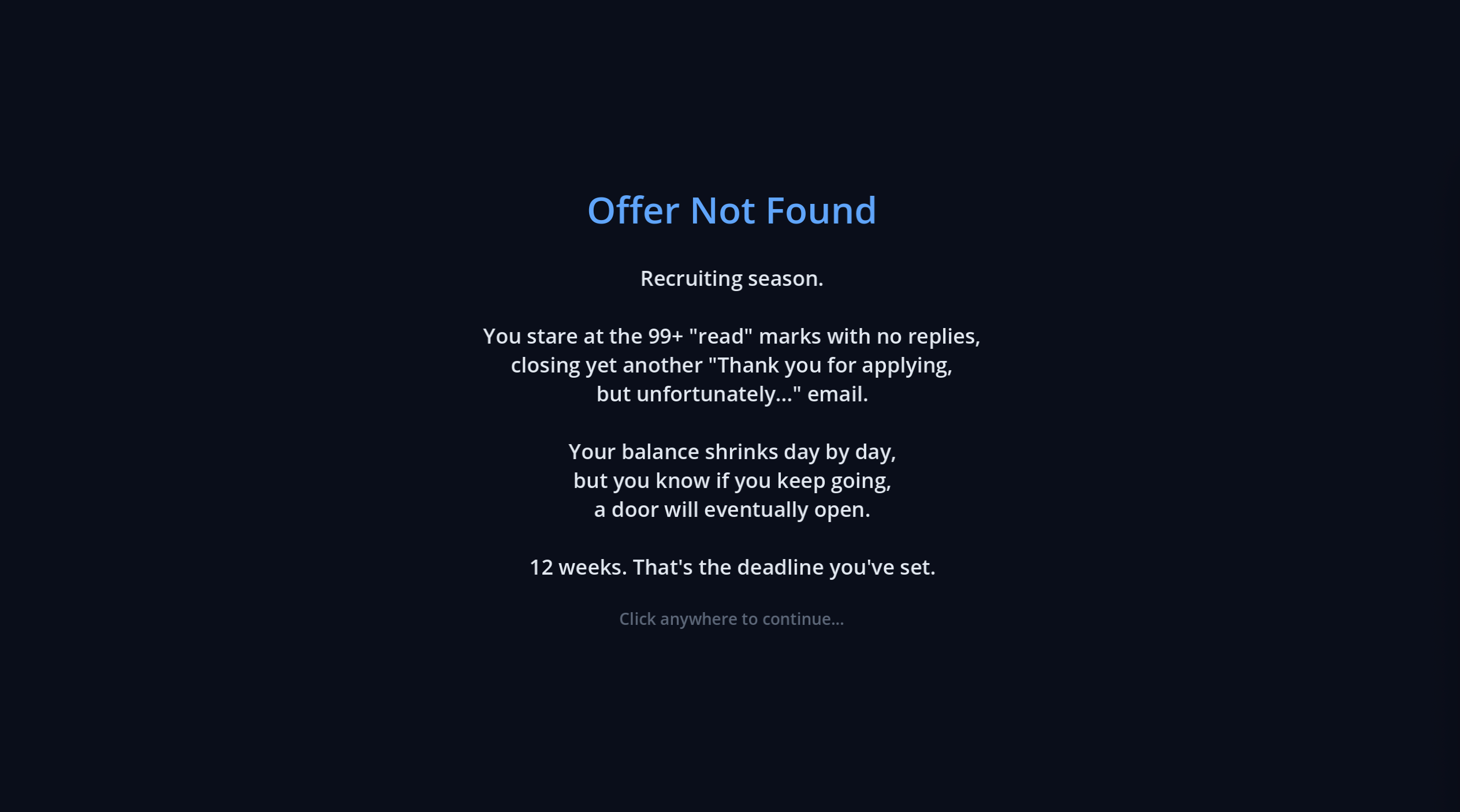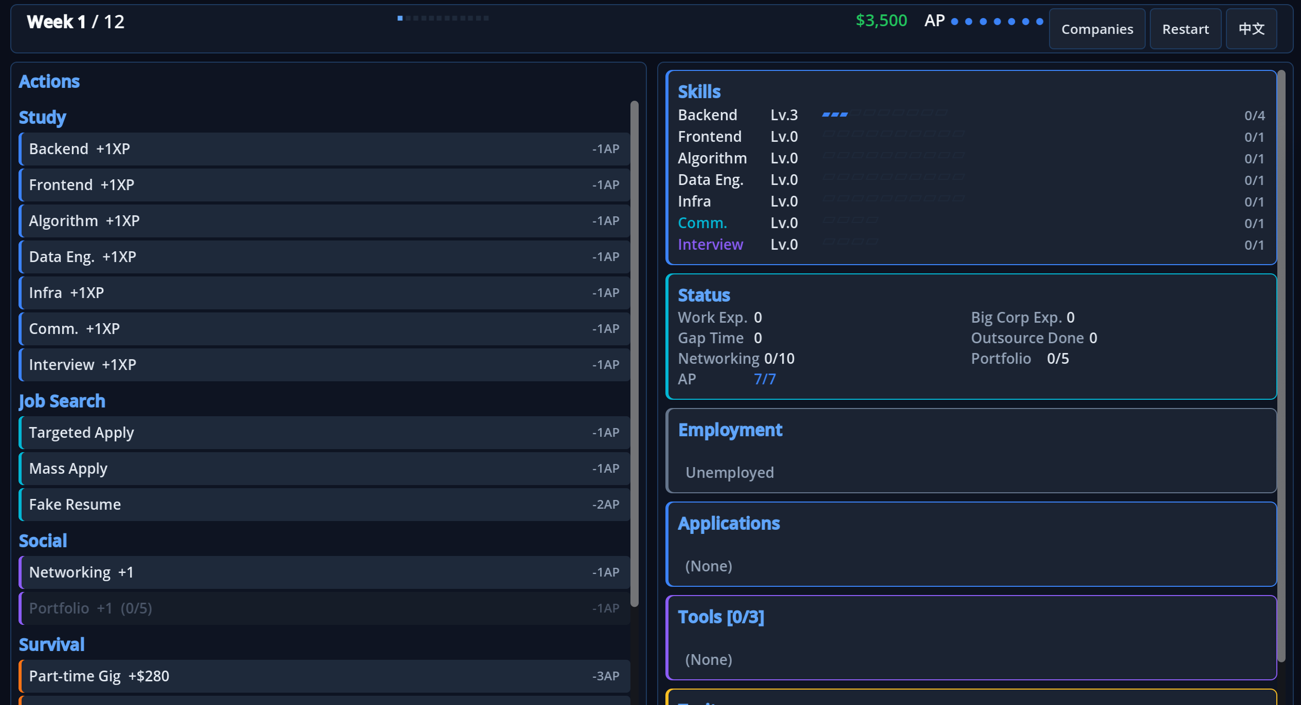 A turn-based job-hunting survival sim for programmers.